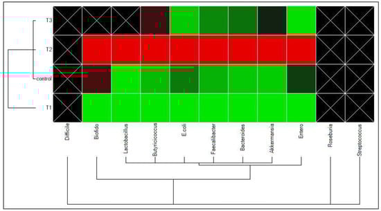 Clustergram of samples and targets in post-hatch chicks (day 35). The data colors indicate greater expression (upregulated—red color), lower expression (downregulated—green color) and no change in expression (no change in regulation—black color). The lighter the color, the greater the expression level determined by CFX96 Touch real-time PCR. C = control diet; T1 = black cumin seed meal 10%; T2 = coconut meal 10%; T3 = 5% black cumin seed meal and 5% coconut meal.