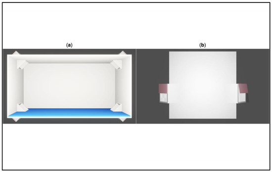 3D reconstruction of the testing arena with the conspicuous landmark. (a) Top view of the rectangular white arena with the blue wall (long version). (b) Frontal view of the arena, with a detail on the corridors. Credit by Greta Baratti.