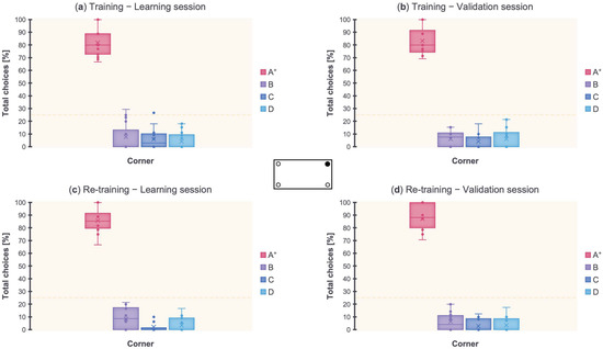 Results. Total choices [%] toward the arena’s four corners (A+, B, C, D). (a) Training phase, learning session. (b) Training phase, validation session. (c) Re-training phase, learning session. (d) Re-training phase, validation session. The dotted line indicates the chance level (25%).