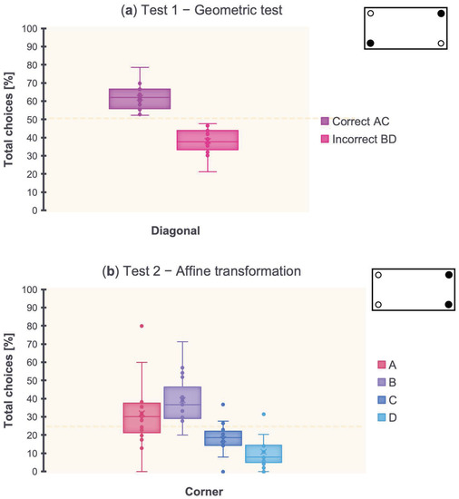A paired-samples t-test was performed by considering the total choices [%] toward the two diagonals (i.e., after having collapsed the two geometrically correct corner positions, A and C, and the two geometrically incorrect corner positions, B and D), in the Test 1—Geometric test (blue wall removal). Results are shown in Figure 4a.