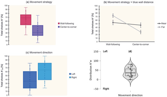 Results. Total choices [%] toward the correct corner position A+ in relation to the use of movement strategy (a), movement strategy depending on blue wall distance (b), and direction, at the population level (c) and at the individual level (d). The dotted line indicates the chance level (50%).