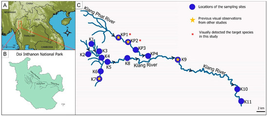 Locations of the sampling sites with indication of previous visual observation. (A) Map of Thailand, (B) a general map of the Doi Inthanon National Park with details of the Klang Phat River and Klang River, (C) location of the sampling sites (N = 15) and visual detection of the target species in this study (N = 2) across the Klang Phat River and Klang River in the Doi Inthanon National Park, Chiang Mai, Thailand.