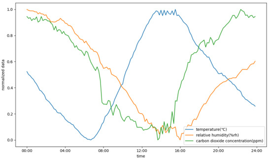 Figure 7 depicts the normalized temperature, relative humidity, and carbon dioxide concentration in the rabbit house over one day.