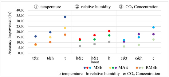 We performed several experiments to evaluate how the number of input variable types affected model performance when predicting the correlation time series. The experiments were carried out as follows. The proposed model takes one type, two types, and three types as input and outputs a single variable. For example, the model inputs are set to temperature; temperature and relative humidity; temperature and CO2 concentration; temperature, relative humidity, and CO2 concentration; temperature, relative humidity, and CO2 concentration; temperature, relative humidity, and CO2 concentration. In contrast, the proposed model is used to predict temperature, and the model prediction accuracy, including MAE, MSE, and RMSE, is recorded.