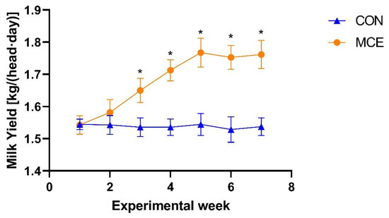 Change in average milk yield throughout the study period in dairy goats. CON—fed a basal diet, MCE—fed a basal diet supplemented with 400 mg/kg macleaya cordata extract. Bars indicate the standard errors. * Superscripts indicate significant difference (p < 0.05), while no-sign superscripts indicate no significant difference (p > 0.05).