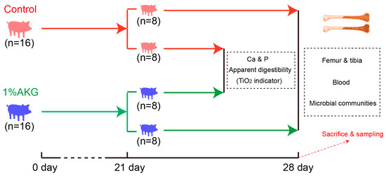 On the 28th day of the experiment, after overnight fasting, blood samples were taken from the anterior vena cava of the remaining 8 piglets in each group; then, piglets were anesthetized with sodium pentobarbital intravenously (50 mg/kg BW) and bled by exsanguination. The femur, tibia, and metatarsal were collected and stored at −20 °C. The colonic digesta were collected, immediately frozen in liquid nitrogen, and stored at −80 °C. The scheme of the experiment design is shown in Figure 1.