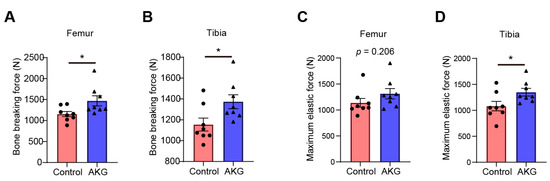 Effects of dietary supplementation with AKG on bone breaking strength and maximum elastic force of femur and tibia. (A) Bone breaking force of femur, (B) bone breaking force of femur tibia, (C) maximum elastic force of femur, and (D) maximum elastic force of tibia are shown. Data were presented as mean ± SEM (n = 8). *, p < 0.05.