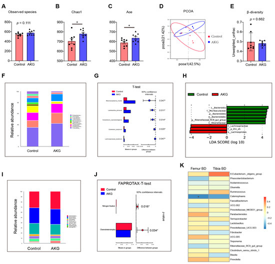 Effects of dietary supplementation with AKG on colonic microbial communities. (A) Observed species, (B) chao 1, (C) ace, (D,E) based on binary jaccard and unweighted unifrac, (F) colonic species composition, (G) T-test analysis of colonic species composition between control and AKG groups, (H) LEfSe analysis of colonic microbiota, (I) relative abundance of colonic microbial function, (J) T-test analysis of microbial function between control and AKG groups, (K) correlation between colonic microbial composition and femur bone mineral density (BD) and tibia bone density analysed by Spearman correlation analysis. Data were presented as mean ± SEM (n = 8). *, p < 0.05.