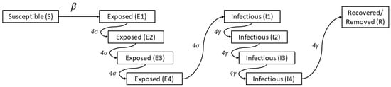Figure 1. Schematic diagram of the susceptible-exposed-infectious-removed (SEIR) model described in the text. Sojourn times in the exposed I and infectious (I) states were split into 4 sub-compartments, effectively following Erlang distributions with shape parameter k = 4.