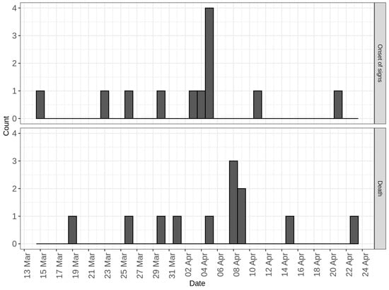 A frequency histogram showing the date of onset of clinical signs and date of death as a function of calendar date is shown in Figure 2. The index case developed clinical signs on 15 March 2019 (day 0) and died four days later on 19 March 2019 (day 4). In total, 10 of the 17 adult pigs in the herd died from ASF. One pig with ASF was culled due to the severity of clinical signs. The last ASF death occurred on 23 April 2019 (day 39). The peak number of pigs with clinical signs occurred on 5 April 2019 (day 21, Figure 2).