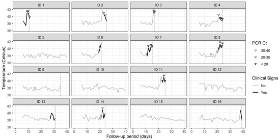 Figure 3 shows rectal temperatures for 16 of the 17 adult pigs in the herd from day 5 (20 March 2019) until the date of death or day 40 (24 April 2019), whichever came first. Eleven of the 16 pigs that were monitored developed fever, defined as a rectal temperature greater than or equal to 40 °C [2], and, of this group, nine died. One pig was culled, and one pig was alive on 24 April 2019 (day 40). A total of 22 real-time PCRs were carried out on 10 pigs, with positive results (PCR Ct < 35) returned on 22 occasions. One pig returned a positive test to PCR on 25 March 2019 (day 10) but did not develop a fever. This pig died on day 26 March 2019 (day 11).