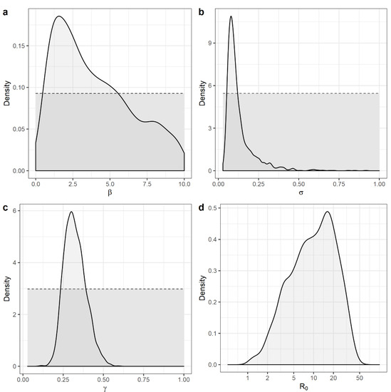 Figure 4. Prior (dashed lines) and posterior (solid lines) distributions for (a) the transmission coefficient β ; (b) the inverse of the average latent period σ; (c) the inverse of the average duration of infectiousness γ; (d) the basic reproductive number, R0 which was a calculated output and (being a ratio) is presented on a logged horizontal axis.