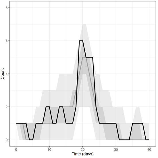 Figure 5. Line plot showing the number of infectious pigs as a function of the number of days since the onset of signs in the first affected pig (black line). Superimposed on this plot are the predicted median (grey line) number of infectious pigs per day. The dark and light shaded areas show the 50% and 95% quantiles around these estimates.