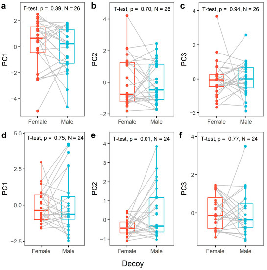 Paired boxplots showing the level of aggression during trials with a female or a male decoy. Female aggression scores based on PC1 (a), PC2 (b) and PC3 (c) and male aggression scores based on PC1 (d), PC2 (e) and PC3 (f) are shown. The grey lines show the difference in individual aggression scores between trials.