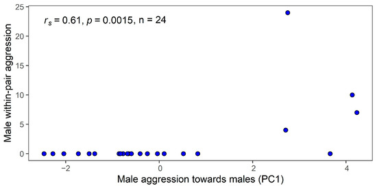 Scatterplot showing the relationship between the number of male within-pair attacks and male–male aggression based on PC1 (NMale = 24). The Spearman correlation coefficient and p-value are shown in the top left corner.
