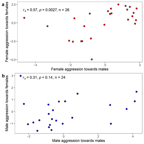 Scatterplot showing the individual consistency between intra-sexual and inter-sexual aggression based on PC1 for each sex (NFemale = 26; NMale = 24). (a) Female aggression towards females versus female aggression towards males; (b) Male aggression towards females versus male aggression towards males. The Spearman correlation coefficient and p-value are presented in the top left corner.