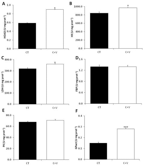 Figure 1 shows the results for the metabolic enzymes related to glycogenolysis, glycolysis, gluconeogenesis, and lipid metabolism in the liver. HOAD (lipid metabolism), HK (glycolysis), LDH (gluconeogenesis), and GPact (glycogenolysis) activity significantly increased in the C + V group. No significant effects were detected in either PK (glycolysis) or FBP (gluconeogenesis) enzymatic activity.