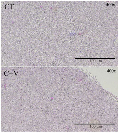 Liver light microscopy details of juvenile C. labrosus fed the control (CT) or C. fusca + V. proteolyticus (C + V) diets for 90 days. Scale bar: 200 μm.