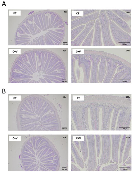 Light microscopy images from the proximal (A) and distal (B) regions of the intestine of juvenile C. labrosus fed the control (CT) or C. fusca + V. proteolyticus (C + V) diets for 90 days. H&E stain, magnification 40×, scale bar 200 μm; 100×, scale bar 200 μm.