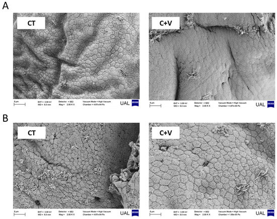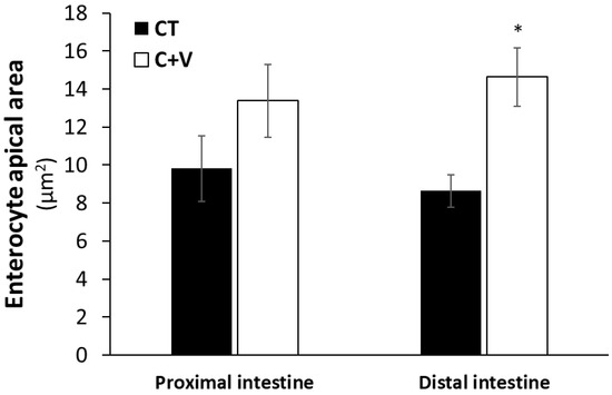 The SEM observations confirmed the integrity of the enterocytes in the fish fed both experimental diets. The intestines presented a mucosa of normal appearance with no intercellular spaces in the apical zone of the epithelium (Figure 4). A morphometric analysis of the SEM images revealed a significant increase (p < 0.05) in the enterocyte apical area in fish fed the C + V diet compared to the CT group (Figure 5).