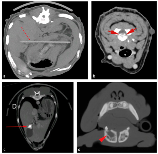 The number and prevalence of incidentalomas at the different sites examined in dogs and cats are shown in Table 4 and Table 5, respectively. In dogs, the prevalence of incidentalomas found in the neck was significantly higher than in the cervical vertebral segment (p = 0.0216; OR = 2.801; 95% CI = 1.222–6.404), thoracic vertebral segment (p = 0.0273; OR = 2.509; 95% CI = 1.101–5.533), lumbar vertebral segment (p = 0.0147; OR = 2.809; 95% CI = 1.189–6.816), and sacral vertebral segment (p = 0.0392; OR = 2.532; 95% CI = 1.068 to 6.166) (Table 4). Moreover, the prevalence of incidentalomas detected in the thorax was significantly higher than in the cervical vertebral segment (p = 0.0015; OR = 3.397; 95% CI = 1.574 to 7.220), thoracic vertebral segment (p = 0.0021; OR = 3.043; 95% CI = 1.460–6.162), lumbar vertebral segment (p = 0.0010; OR = 3.406; 95% CI = 1.571–7.354), and sacral vertebral segment (p = 0.0029; OR = 3.071; 95% CI = 1.410 to 6.653) (Table 4). Finally, the prevalence of incidentalomas found in the abdomen was significantly higher than in the head (p = 0.0155; OR = 1.966; 95% CI = 1.128–3.364), thoracic vertebral segment (p = 0.0006; OR = 3.396; 95% CI = 1.678–6.871), lumbar vertebral segment (p = 0.0002; OR = 3.802; 95% CI = 1.806–8.073), and sacral vertebral segment (p = 0.0009; OR = 3.428; 95% CI = 1.620–7.304) (Table 4). The number and prevalence of incidentalomas depending on the number of sites examined in dogs and cats are shown in Table 6 and Table 7, respectively. The typologies and number of incidentalomas in dogs and cats are shown in Table 8. Table 9 shows the typologies of the incidental findings based on the age of the dogs and cats. Figure 1 shows some examples of the incidentalomas found by CT.