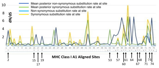 MEME overlay plot for codons associated with the mammalian peptide binding region (PBR) are shown numerically below the X-axis with notations for the location of amino acids associated with the PBR for the A1 exon following [27].