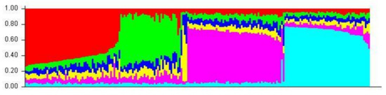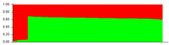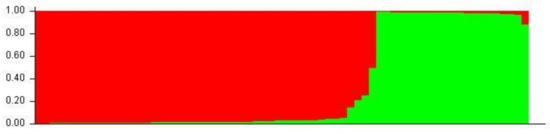 - Pritchard, J.K.; Stephens, M.; Donnelly, P. Inference of population structure using multilocus genotype data. Genetics 2000, 155, 945–959. [Google Scholar] [CrossRef]