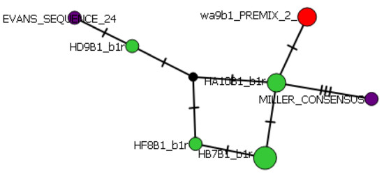 Using the median-joining network method, phylogenetic maps created in PopART (version 1.7) show the distances of each allele, and their differentiation from their most closely related individual (indicated by hash lines on each connecting arm). PopART allows for visualization of intraspecific relationships and haplotype inference. The central web of alleles is only differentiated from two of the connecting arms by one variation in the amino acid sequence but show considerable differentiation from the Evans and Miller consensus sequences (derived from British Columbian Chinook salmon) [2,4]. These mutations are shown as a hatch marks on the connecting arms. The Class II haplotype network shows the most variation between the Miller sequence and the additional seven alleles present (Figure 8).