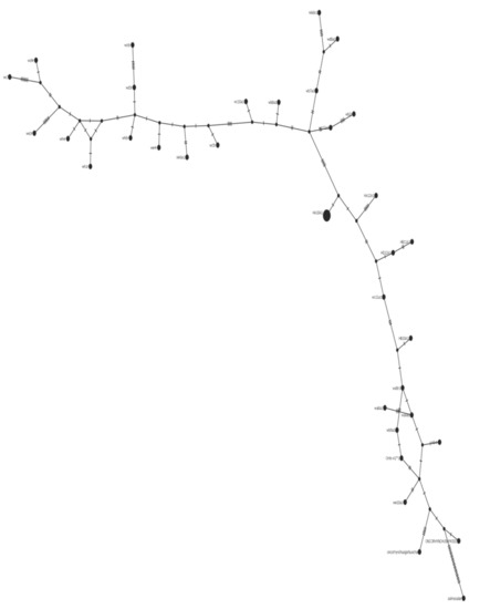 - Leigh, J.W.; Bryant, D. Popart: Full-feature software for haplotype network construction. Methods Ecol. Evol. 2015, 6, 1110–1116. [Google Scholar] [CrossRef]