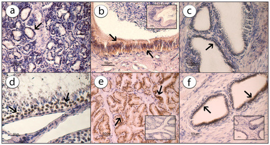Immunostaining for ADIPOR1 in bulbourethral gland (a), epididymis (b), seminal vesicle (c), testicle (d), prostate (e) and vas deferens (f) counterstained with hematoxylin. The arrows indicate the positive localization of the immunoreaction, while the inserts in (b,e,f) are examples of the negative reactions.