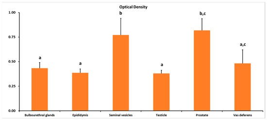 Immunoreaction intensity of ADIPOR1, performed on adult ram male reproductive tissues. Different letters above bars indicate significantly different values (ANOVA p < 0.001, Levene’s test p > 0.05).