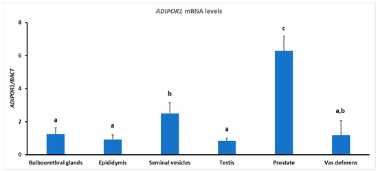 RT-qPCR analysis of ADIPOR1 gene expressions performed on adult ram male reproductive tissues. Different letters above bars indicate significantly different values (ANOVA p < 0.001, Levene’s test p > 0.05).