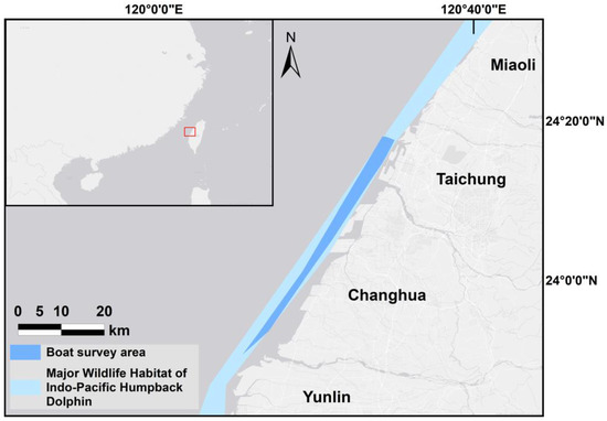 The major wildlife habitat of the Indo-Pacific humpback dolphin and the boat survey area along the west coast of central Taiwan.