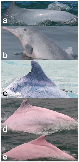 Images of Sousa chinensis in different coloration stages: (a) calf, (b) mottled stage, (c) speckled stage, (d) spotted adult, and (e) unspotted adult.