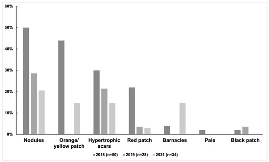 Prevalence of skin lesions in 2018, 2019, and 2021.