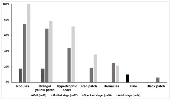 At least one category of skin lesion was observed in 33 of 57 distinctive individuals (58%). The prevalence of skin lesions was 62% (31/50) in 2018, 39% (11/28) in 2019, and 41% (14/34) in 2021. Among the 57 distinctive individuals, the prevalence of the six categories of skin lesions was as follows: nodules (51%), orange/yellow patch (44%), hypertrophic scars (30%), barnacles (12%), white patch (2%), and black patch (2%). Nodules were the most prevalent skin lesion in each year (Figure 5 and Table 4). A pale lesion was observed in only one individual in three years, and a black patch only appeared in another individual sighted in both 2018 and 2019. Orange/yellow patches and barnacles were not observed in 2019. The prevalence of skin lesions of the 57 distinctive individuals in each age class was as follows: calf (10%, 1/10), mottled (24%, 4/17), speckled (88%, 14/16), and adult stage (100%, 14/14). The adult stage showed a higher prevalence of nodules, orange/yellow patches, hypertrophic scars, and red patches (Figure 6). Among the 17 resighted individuals, no skin lesions were noticed in three individuals. In addition, at least one category of skin lesion was found in seven individuals in all three years, while other individuals showed different conditions of lesion remission and relapse (Figure 7).