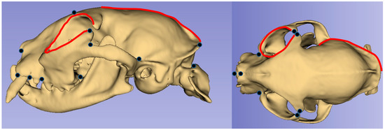 The images were converted to the “tps” format using tpsUtil (version 1.74) software [18]. A total of 8 landmarks and 63 semi-landmarks for dorsal view and 11 landmarks and 41 semi-landmarks for lateral view were used (Figure 1). Semilandmarks were used for the border of the orbit and along the borders of the temporal fossa (the external sagittal, nuchal, and temporal crests). Here, TpsDig2 (version 2.32) was used for landmark operations [19].
