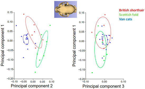 Principal component analysis scatter plot comparing skull morphology of cat breeds (dorsal view). Ellipses represent 95% confidence intervals around the means.