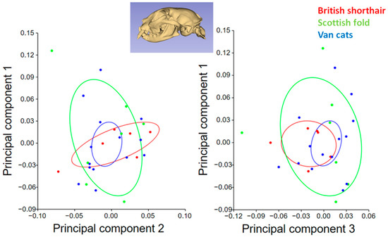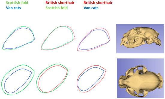 The shape difference between the skull of the wolf and the German Shepherd was investigated by the geometric morphometric method [3]. This study found that the differences in shape between the two species were most often expressed in the parietal, occipital, zygomatic, temporal bones, and the ramus of the mandible. The authors reported that the skulls of the wolf and the German Shepherd differed significantly in shape. In another study, the shapes of dingo skulls from different regions of Australia were examined [15]. Demircioglu et al. [16] analyzed shape differences between ram and sheep skulls. They also detected a significant sexual dimorphism of the skull. Furthermore, other authors proved dimorphic features of canine skulls [17]. However, the literature lacks studies comparing the shape of the skull between cat breeds. In this study, the shape variations of the skull of British Shorthair, Scottish Fold, and Van cats were investigated.