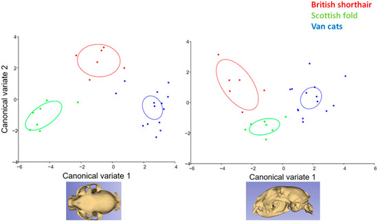 In our research, it has been proven that the shape of the skull of each of the three cat breeds studied shows distinct characteristics. In the canonical variate analysis, it was observed that the breeds were separated from each other. However, there are some similarities between the British Shorthair and Scottish Fold, and Van cats occupy more distant areas in the charts. These results reflect the belonging of the examined cats to different morphotypes. The British Shorthair and Scottish Fold belong to brachycephalic cats, while the Van cat is a mesocephalic breed, with a morphology more similar to its wild ancestors.