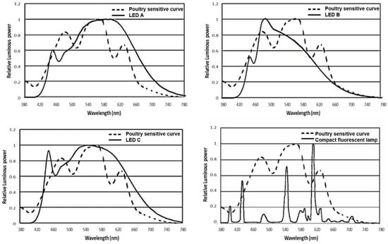 Comparison of spectrum readings of the three light emitting diode bulbs and one compact fluorescent lamp used in this study. LED, light emitting diode; The poultry sensitive curve was adapted from a previous publication [16].