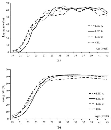 The estimated parameters in the models illustrate the egg-laying characteristics of each group. As the rate of decrease in laying ability, the b of LED C was high. As the reciprocal indicator of the variation in sexual maturity, the c of the CFL group was low. As the mean age of sexual maturity of the hens, the d of LED A was the least, and that of LED B group was the largest.