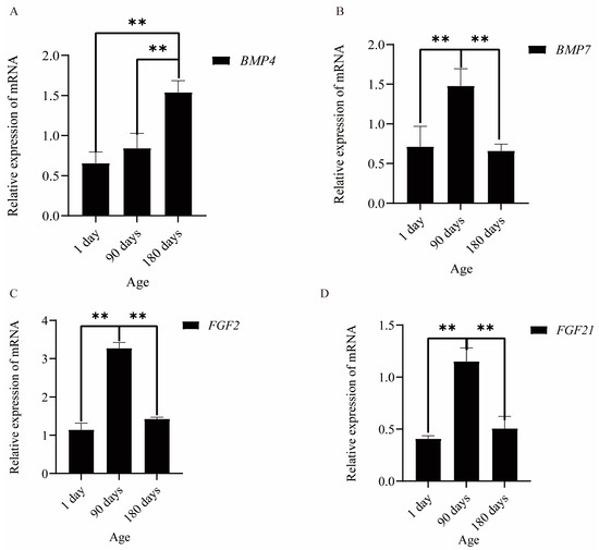 (A–D) represent the expression of BMP4, BMP7, FGF2, and FGF21 at different time points (n = 5); Data are presented as least squares means ± SEM; ** signifies a highly significant difference at p ≤ 0.01.