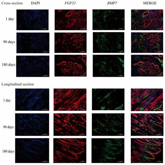 The expression of FGF and BMP genes on the 1st, 90th, and 180th day-olds was tested (Figure 2). We found the expression of FGF2, 21, and BMP7 genes on the 90th day was higher than that at the other two time points. The level of BMP4 expression increased over time. Moreover, the protein of FGF21 and BMP7 was determined (Figure 3). FGF21 protein was expressed mainly in the dermal papilla, inner root sheath, outer root sheath, and epidermis. BMP7 was mainly expressed in the interstitial tissue between hair follicles, almost not at all in the hair follicle area; and the expression level of BMP7 in the epidermis was lower than that of FGF21.
