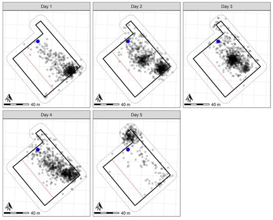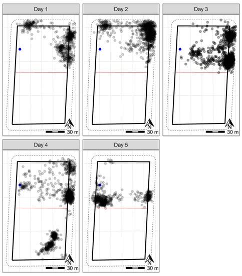 GPS plots per day for six sheep in the five-day Chiswick trial with the water point indicated in blue. The grey points indicate the GPS positions (measured every 10 min) of individual sheep throughout the day. Darker points indicate point overlay in locations where sheep were registered more frequently. The solid black outline indicates the wire fenced paddock boundary. The dashed lines on the outside of the paddock boundary indicate the 10 m buffer zone used to clip the data to remove recording errors based on GPS drift. The red line across the width represents the virtual fence. A scale is included to indicate paddock size.