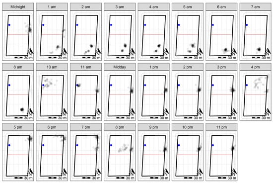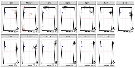 GPS plots across 23 h on day four of the trial for 10 sheep at Lameroo, with the water point within the inclusion zone indicated in blue. The grey points indicate the GPS positions (measured every 10 min) of individual sheep throughout the day. Darker points indicate point overlay in locations where sheep were registered more frequently. The solid black rectangle indicates the wire fenced paddock boundary, with the red line representing the virtual fence. The dashed lines on the outside of the paddock boundary indicate the 10 m buffer zone used to clip the data to remove recording errors based on GPS drift. The data at ‘9 am’ were removed, as the animals were yarded at this time. A scale is included to indicate paddock size.