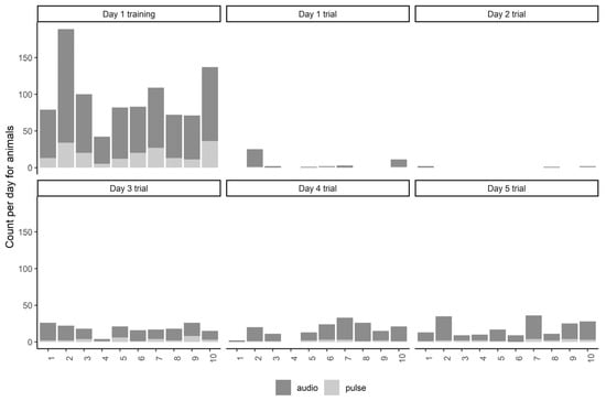 The total number of audio cues and electrical pulses per individual animal across each day of the trial at Lameroo, including during the initial training period on day 1. The incursion period where animals crossed into the exclusion zone on the third night (01:00–09:00) is not displayed (mean data for this period are presented in Table 1).