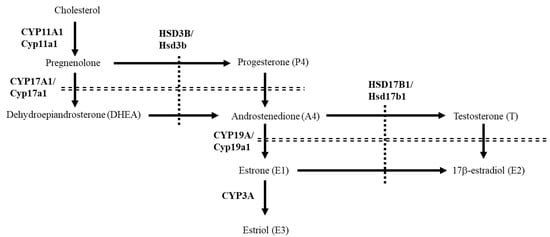 Steroid hormones are produced from cholesterol in a series of steps catalyzed by cytochrome P450 hydroxylases and hydroxysteroid dehydrogenases (Figure 1). Among these steroidogenic genes, 17β-hydroxysteroid dehydrogenases (HSD17B), which include at least 14 family members, have been identified as enzymes that interconvert 17-keto and 17-hydroxy sex steroids [1]. Of these family members, human HSD17B1 is mainly expressed in ovarian granulosa cells and the placenta to regulate the production of active sex steroids [2]. HSD17B1 efficiently catalyzes the conversion of the weak estrogen, estrone (E1), into active estradiol (E2). In addition, it converts androstenedione (A4) to testosterone (T). The rodent Hsd17b1 enzyme catalyzes the conversion of A4 into T at a similar efficiency to that of E1 to E2, whereas it was indicated that the catalytic efficiency of human HSD17B1 for the A4 to T reaction is very weak or barely detectable [3,4], although contrasting results have recently been reported [5].