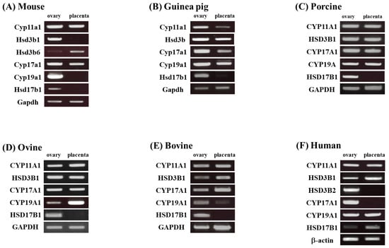 Expression of steroidogenic genes in ovary and placenta of various mammalian species. RT-PCR analyses of each gene in the ovary and placenta of a mouse (A), guinea pig (B), porcine (C), ovine (D), bovine (E), and human (F).