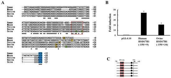 The alignment analysis of the HSD17B1 gene and its 5′-flanking region was performed using Clustal W. Accession numbers of analyzed nucleotides are as follows: human HSD17B1 gene (M27138.1), mouse Hsd17b1 gene (AF363242.1), porcine chromosome 12 including HSD17B1 gene (NC_010454.4), bovine chromosome 19 including HSD17B1 gene (LR962874.1), and ovine chromosome 11 including HSD17B1 gene (NC_056064.1).